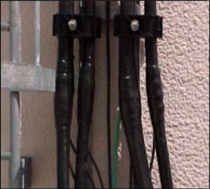 室外馈线必须接地,每条馈线都应该用接地夹和截面积为 16 平方毫米的接地线接地,并且接地点应在接近直放站一端,先剥开一段馈线的护套,长度与接地夹相同,把接地夹套在该段的铜屏蔽层上,用钢丝钳夹紧,并用 16 平方毫米的接地线接好地,接地夹与馈线的连结处用防水胶布包好。
